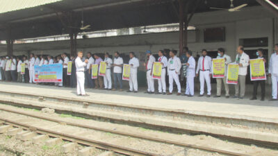 ময়মনসিংহে রেলওয়ে রানিং স্টাফ সংগ্রাম পরিষদের মানববন্ধন ও বিক্ষোভ