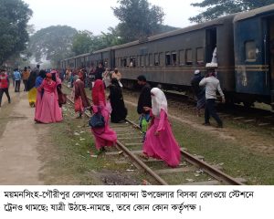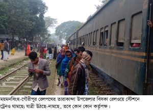 স্টেশনে তাদের মধ্যে অনেকেই এসেছেন, নানা গন্তব্যের জন্য। ট্রেন কখন আসবে তারা কেউ জানে না! ট্রেন আসবে সেটা জানে; সেই আশায় অপেক্ষা করছেন শিশু-বৃদ্ধ, মাঝবয়সী অর্ধশত মানুষ। রাস্তায় কলা বিক্রি করে জীবিকা নির্বাহ করেন হোসেন আলী (৬৫)। তার বাড়ি কাকচর গ্রামে। তিনি জানান, ট্রেন তো আসবেই! জারিয়া-মোহনগঞ্জ ট্রেন আছে; একটু দাঁড়ান। স্টেশন প্রসঙ্গে বলেন, টিকেট দেয়ারও লোক নাই, গাড়ির কথা কওয়ারও লোক নাই। স্টেশনে কর্মকর্তাদের ভবনগুলো ও অফিসগুলো নষ্ট হচ্ছে। গজহরপুর গ্রামের খোরশেদ আলম জানান, স্টেশনে লোকজন না থাকায় সব মালামাল চুরি হয়ে যাচ্ছে। যাত্রীরা টিকেট করতে পারছে না। উঠছি বিসকা থেকে মোহনগঞ্জের ভাড়া দিতে হচ্ছে মোহনগঞ্জের ট্রেনে উঠে (ট্রেনের ছাড়ার স্থান থেকে চার্জ ধরায়) ময়মনসিংহ গিয়ে, এতে জরিমানা গুনতে হচ্ছে, যাত্রীরা দুর্ভোগ ও অপমানিত হচ্ছেন। তারাকান্দা উপজেলার বিসকা রেলওয়ে স্টেশনের একটি কক্ষ ভাসমান মলমূত্র ত্যাগের কারণে গণল্যাট্টিনে পরিণত হয়েছে। অবশিষ্ট কক্ষগুলোতে ঝুলছে তালা। কর্মকর্তা-কর্মচারীদের আবাসিক ভবনগুলো অযত্ন-অবহেলা বিনষ্ট হচ্ছে। এ স্টেশনে জারিয়া, মোহনগঞ্জ, ভৈরবগামী ১২টি ট্রেনের যাত্রী উঠানামা করে। আন্তঃনগর হাওর ও আন্তঃনগর বিজয় এক্সপ্রেস ট্রেন অতিক্রমের সময়ও এ স্টেশনে উড়ে না লাল-সবুজের পতাকা। গৌরীপুরের বোকাইনগর রেলস্টেশনের নামটিও ধসে পড়ছে। স্টেশনের কার্যালয়টির সব মালামাল লুট হয়ে গেছে। দাঁড়িয়ে থাকা কঙ্খালসাড় ভবনটিও হারিয়ে যাওয়ার শংকা দেখা দিয়েছে। এ স্টেশনে এখন আর কোনো ট্রেন থামে না। এ প্রসঙ্গে গৌরীপুর উপজেলা প্রেসক্লাবের আহ্বায়ক মো. রইছ উদ্দিন বলেন, গৌরীপুর উপজেলার বোকাইনগর একটি ঐতিহাসিক এলাকা, জনসাধারণ ও কৃষকপর্যায়ের উন্নয়নের জন্য স্টেশনের কার্যক্রম চালু করা প্রয়োজন। সেই সাথে ময়মনসিংহ-ভৈরব রেলপথে ৪টি লোকাল ট্রেন চালু করা অত্যন্ত প্রয়োজন। তিনি আরও বলেন, রেলওয়ে সারাবছর কোটি কোটি টাকার লোকশান গুণে, আবার স্টেশনে গিয়ে ট্রেনের টিকেট মিলে না। রেলখাতকে সরকারের লাভবান খাত হতে পারে, এ স্টেশনগুলো চালুকরণের মধ্য দিয়ে। এ দিকে ঈশ্বরগঞ্জ রেলস্টেশনের ভবনগুলো ধ্বংস হয়ে যাচ্ছে। স্টেশনে কার্যক্রম না থাকায় নষ্ট হচ্ছে রেলওয়ের মূল্যবান সম্পদ। রেলওয়ে টিম্যান সোলামায়ন এ স্টেশনে সবেদল নীলমণি। তিনিও সবকিছুর দায়িত্ব পালন করছেন। তবে করোনাকালীন দুর্যোগে লোকাল ট্রেন বন্ধ হওয়ায় এ স্টেশনে শুধুমাত্র নাসিরাবাদ এক্সপ্রেস যাত্রা বিরতী করে। এরপরেই রয়েছে সোহাগী রেলস্টেশন। দু’টো স্টেশনেই রয়েছে বুকিং অফিস, যাত্রী ছাউনি. আবাসিক কোয়াটার, স্টেশন মাস্টার অফিস, সিগন্যাল ব্যবস্থাসহ নানা কার্যালয়। তবে এসব 